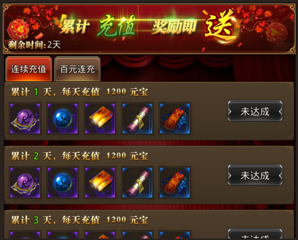 活动内容:活动期间,每天单笔充值金额达到目标即可领取奖励。