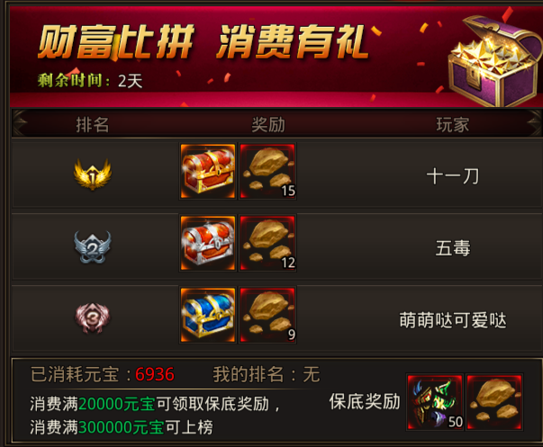 活动内容:活动期间消耗50000元宝即可参与排行,排名前三可获得对应排名奖励,其余玩家可获得保底奖励,保底奖励根据消费金额分若干档次,请以游戏内为准。