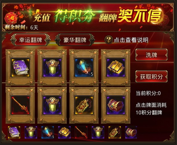 活动内容:活动期间,玩家每充值100元宝即可获得1积分,消耗积分可以翻牌,每轮共8张牌,次日重置。